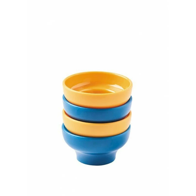 - Contenu : 2 coquetiers jaune safran 2 coquetiers bleu pétrole 1 toqueur à oeuf acier et bleu 1 salière acier et bleue