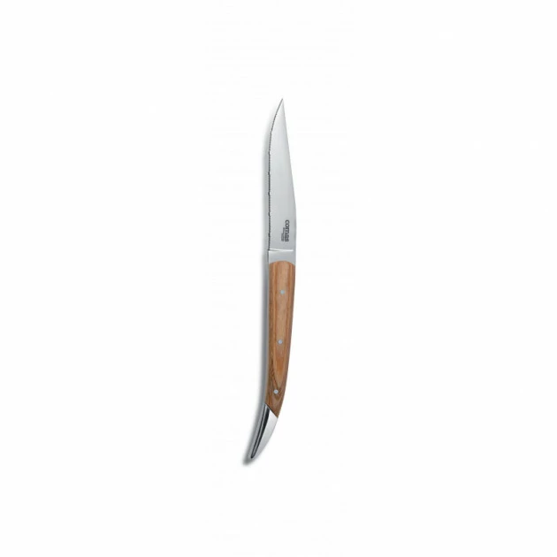 La lame en inox 420 du couteau à steak NICOLAS Comas se pare d’un fil dentelé. Dans son prolongement se trouve un manche en bois clair fixé par 3 rivets et entouré d’une mitre de tête (entre le manche et la lame) et d’une mitre de pied (à l’opposé). Loin d’être seulement accessoires, les mitres du couteau à viande NICOLAS Comas visent à protéger la lame et le manche en cas de chute et à apporter plus d’équilibre lors de la prise en main.