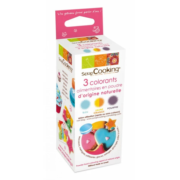 DLUO Dépassée Lot de 3 Colorants en Poudre Alimentaire Pourpre/Orange/Bleu Scrapcooking