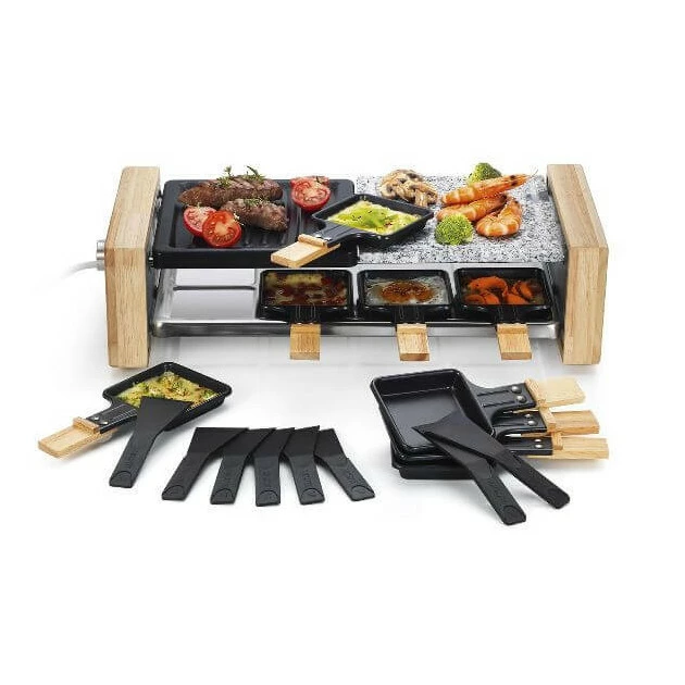 Pouvant nourrir jusqu’à 8 personnes, cet appareil comporte un espace raclette, une plaque de grill, ainsi qu’une pierrade. Vous pouvez donc faire fondre de fromage, cuire des légumes et de la viande en même temps. Cette versatilité permet un gain de place certain dans votre cuisine.