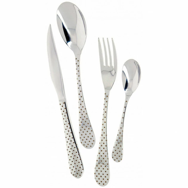 Pour décorer joliment et de manière originale votre table lors d’une réception ou simplement lors de vos repas quotidiens, c’est la Ménagère 24 pièces Constellation en Inox qu’il vous faut. Grâce à ses 3 mm d’épaisseur, ces couverts de table restent discrets à votre table tout en apportant une petite touche d’originalité avec des détails en pois gravé sur les manches des 6 fourchettes, couteaux, cuillères de table et cuillères à café.