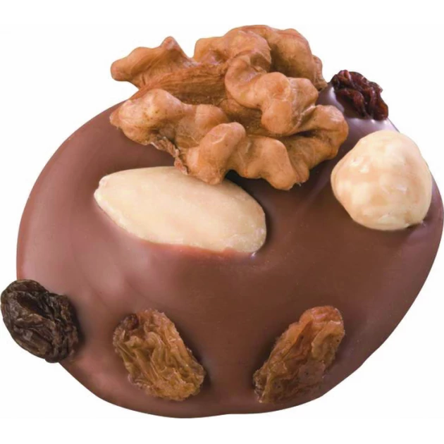 - Ingrédients : Pâte de cacao, sucre, noix, raisins secs, noisettes, amandes, beurre de cacao, graisse de lait, émulsifiant : soja E322, arôme naturel de vanille, huile végétale (graine de cocon).