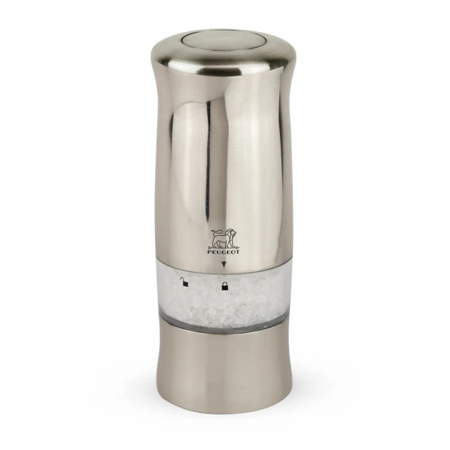 Le corps du Moulin à Sel Electrique Zeli 14 cm Peugeot est fabriqué en ABS (couleur : imitation inox) ce qui lui confère une grande légèreté lors de son utilisation. Il possède également une partie transparente, qui permet de voir la quantité de sel restant.