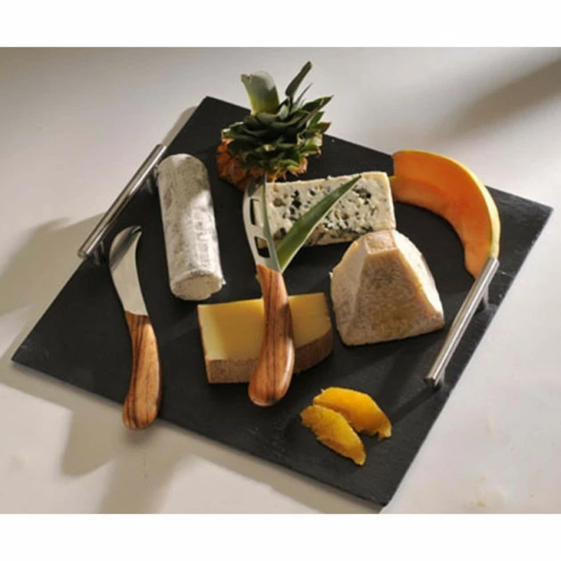LeBrun présente ce plateau à fromage en ardoise carré gravure centrale au laser avec ses poignées métalliques. Ce plateau s’accompagne de 2 couteaux à fromage avec le manche en bois clair.