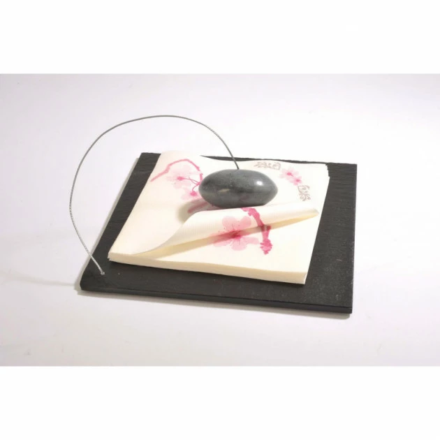 Ce galet qui sert de presse-papier permet d’utiliser ce porte serviette autant à l’intérieur qu’à l’extérieur, en évitant que le vent ne fasse s’envoler les serviettes.