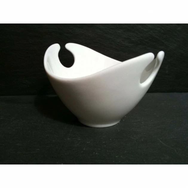 LeBrun présente ce joli saladier Jonque en porcelaine blanche en forme de coque. Le saladier est accompagné de son service à salade en inox.