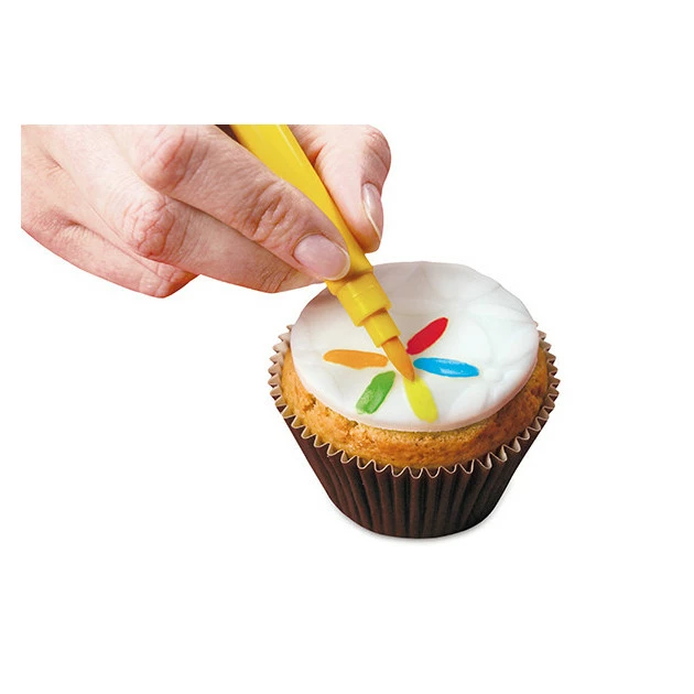 Il suffit de faire rouler l’accessoire sur la pâte afin d’y imprimer les fleurs. Vous pouvez laisser comme ça ou finir par les colorier avec des feutres alimentaires pour apporter une finition originale à vos gâteaux et pâtisseries !