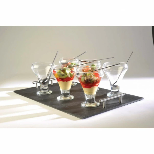 Ce service entrées et desserts proposé par LeBrun se compose de 13 pièces. Avec 6 coupelles en verre Hawaï, 6 pelles à glace, exposé sur un élégant plateau en ardoise avec ses poignées métalliques.